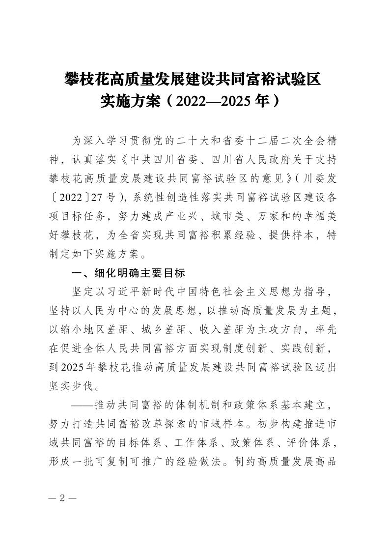 中共攀枝花市委攀枝花市人民政府关于印发《攀枝花高质量发展建设共同富裕试验区实施方案(2022—2025年)》的通知